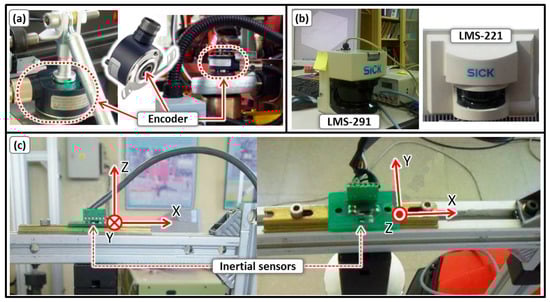 Some sensors used in the proposed experimental platform. (a) Industrial-grade absolute optical encoders; (b) LIDAR sensors being tested in the lab; (c) MEMS inertial sensor testing.