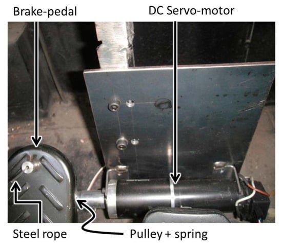 The implemented brake control system consists of a 24-volt DC motor (70 watts) with a gearbox (74:1) and encoder and a pulley with a steel cable whose free end is connected mechanically to the brake pedal (Figure 3). This system works under digital PID closed-loop control receiving the desired reference velocity from the high level control system and comparing it with the actual velocity (provided by different sensors like encoders installed in the bus wheels or others). This system is very useful in practice, not only to stop the vehicle, but especially to regulate, working in combination with the throttle control, the bus velocity according to the desired values. There is an additional advantage consisting of the automatic regulation of the velocity independently of the road slope (positive or negative). Figure 4 shows the flowchart for the velocity control.