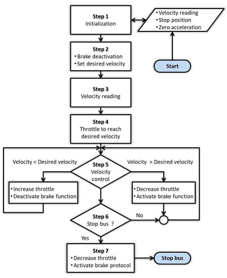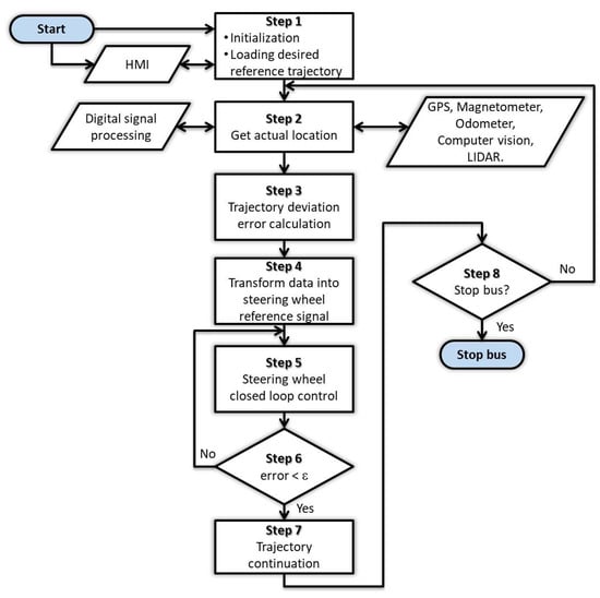 Regarding the desired trajectory, there are many possible ways to determine it, like manually driving the bus and recording the GPS coordinates, navigation with computer vision or LIDAR and logging data with the odometer or GPS, or just in real time with a magnetometers array looking for (detecting) hidden magnets on the path, among others. In Figure 6, the flowchart for the steering control implemented in this work is shown.