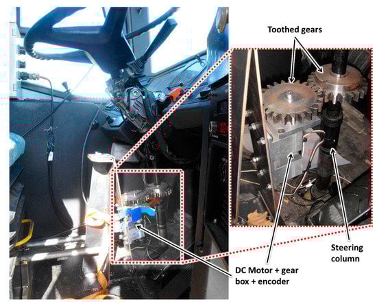 Regarding lateral control, an electric actuator composed of a DC motor, gearbox and encoder has been installed on the steering column (see Figure 5). The actuator receives commands from the lateral control system, so that the vehicle will track the desired trajectory. It takes into account the steering limit, which in this case is ±900°. At the same time, it makes the axle of the front wheel range between ±45°. The feedback to the lateral control system is obtained by means of actual (lateral) position information in the form of the angular position (obtained from the different sensing possibilities: GPS, magnetometers, encoders, etc.), which is compared with the angular position command.