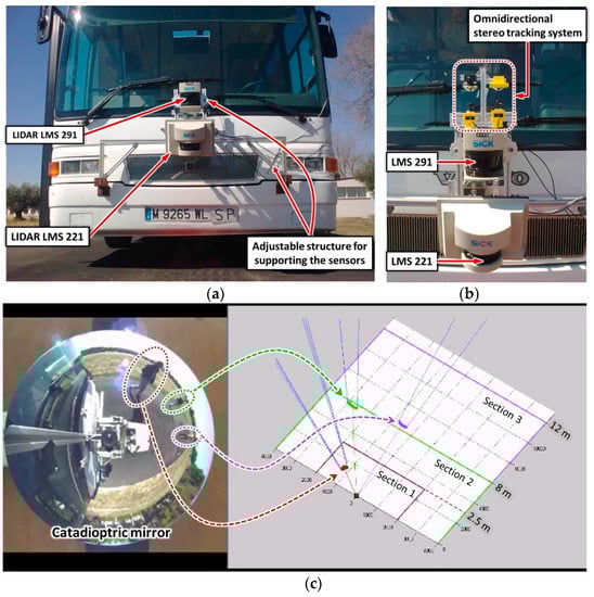 Figure 7a shows the LIDAR system installed at the bus front, at a height of 930 mm and 1490 mm above the soil plane. The supporting structure is mechanically adjustable to permit several angles of inclination for these sensors. Figure 7b shows the omnidirectional stereo tracking system, which has been attached to the LIDAR system, with the aim of being used in some experimental trials to evaluate the efficiency of the obstacle detection process. With a range of angular action of 180 degrees and its real-time capabilities, the LIDAR can be used to detect animate or inanimate objects. This system can be used for the bus’s own safety and that of its passengers in the case of finding inanimate obstacles close to the bus front and/or for the safety of a moving object crossing the bus path.