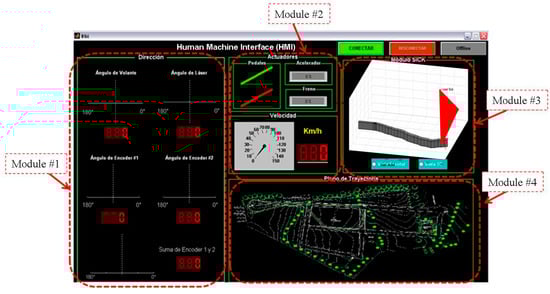 The i-client consists of a graphical interface and a “Configuration_Profile Manager”. The graphical environment is intended to display the multiple variables of the vehicle; the variables are classified and positioned in four groups or modules (see Figure 9). Module #1 displays the variables strongly associated with the steering control: the steering wheel position (angle) and the trajectory deviation angle. Module #2 shows the variables related to vehicle movement, i.e., the velocity and the interpretation of the brake and accelerator pedals. Module #3 is used for the depiction of the information acquired by the range sensor (LIDAR), whether it is displaying the data in 2D or 3D. Module #4 shows the bus trajectory. The Configuration_Profile Manager is in charge of supervising the execution of the i-client, according to the user’s requirements.