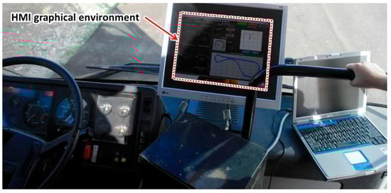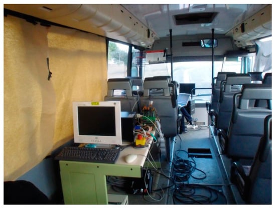 The source data for the bus’s desired trajectory are processed by the control system, and specific filtering is applied depending on the selected source. The overall system architecture is illustrated in Figure 11, and a general view of the installed instrumentation inside the bus is shown in Figure 12.