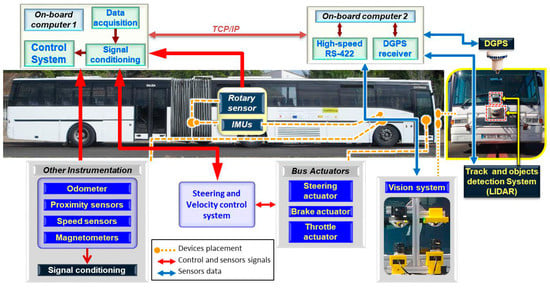 Research on autonomous bus control requires deploying multiple sensors and actuators so that they can be used for both monitoring and control. Furthermore, a control system of this kind involves many variables to analyze and monitor during the testing period of the system and also during the various stages of implementation and demonstration. Therefore, it is of considerable importance to organize a robust observation and acquisition information architecture to gather the sensor signals that are set up in the system. The analysis and interpretation of those variables will benefit the design and the comparison of the different control strategies to be implemented for the automation of the articulated bus. Additionally, experimentation with transport systems of large dimensions requires special care for safety, and this requires knowing the state of the vehicle at all times. This information must be known to both the people who go on board the vehicle and to those working at different points of the test facilities. The electronic instrumentation system includes the elements shown in Table 1. In Figure 2, some sensors are shown during the operating tests carried out in the laboratory.