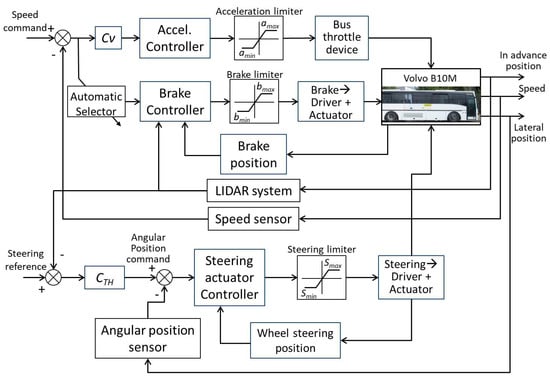 Figure 13 shows the longitudinal and lateral control scheme implemented in the bus Volvo B10M ART-RA-IN. Regarding longitudinal control, the system acts on the PotBox of the bus, which has an action range of 0 to 5 DC volts, rather than acting on the throttle, because the control over acceleration/speed of the bus is better in this case and more controllable. The acceleration is limited (saturated) in order to protect the PotBox and not to exceed the desired speed over limits that cannot be controlled, according to the experimental tests.