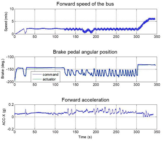 The results of longitudinal control for one of the experiments can be noticed in Figure 14, where a comparison among the speed of the vehicle, the position of the brake and the acceleration along the longitudinal axis (bus forward motion) obtained through an IMU installed on the front axle is presented. In this experiment and during most of the trajectory, the commanded speed was about 10 km/h, because the test lane contains small radii of curvature and slopes. In the last trajectory segment of the test lane (straight line), the speed was increased up to 20 km/h. It can be noticed in Figure 14 that 25 s after the start, the brake system applies a brake signal to check if the system is working properly. Then, the main application of the brake controller is to regulate the speed commanded mainly during the downward slope section. This takes place between the times 125 and 300 s, approximately. It can be noticed in Figure 14, for this period of time, that the brake signal (and correspondingly, the acceleration signal) shows an oscillation due to the chosen algorithm for the brake system, where a command signal in the shape of a saw-tooth is entered into the brake controller, which acts as a Proportional-Integral (PI) action and provides a comfortable sensation of very near constant speed, as should be expected.