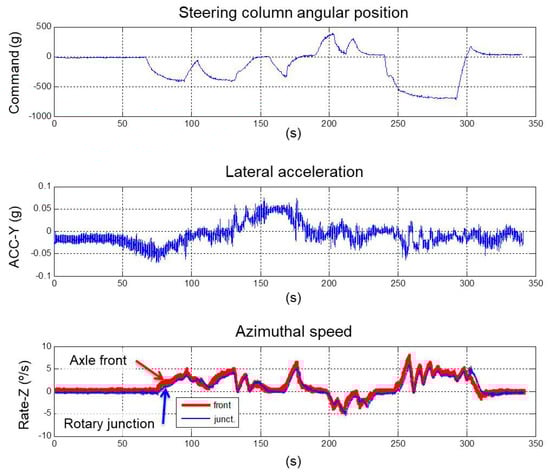 Figure 15 shows the experimental results obtained by applying the lateral control of the bus for tracking the required trajectory. This figure shows the steering command, the lateral acceleration of the bus and the angular rate on the z-axis (azimuth). The angular rate sensor follows the curves of the trajectory commanded by the bus steering. The azimuthal speeds have been measured at two different points; the first, on the bus front axle, and the second, on the rotatory junction of the bus, in order to know both characteristics of its behavior. One of them is to know the position of the last section with respect to the first section of the bus. The lateral acceleration signal can be used in a feedback loop lateral control to improve the tracking of the trajectory. Using this signal in the control system, small lateral movements will be diminished.