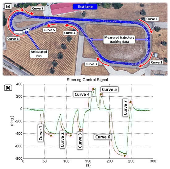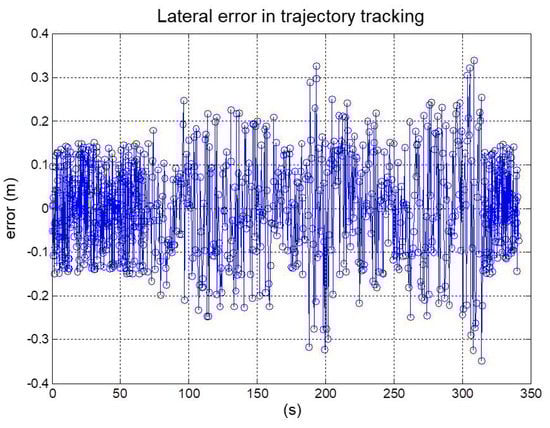 The lateral error during the trajectory tracking was relatively small and within the safety margins established in the control strategy. Figure 16 shows that the maximum peaks of the lateral error were approximately 0.35 m, these peaks being located in the smallest curvature radii sections, where the bus front is more separated from the theoretical trajectory to precisely cope with the curvature. During most of the trajectory, the lateral error was about or less than 0.10 m, which is acceptable for a bus of these dimensions.