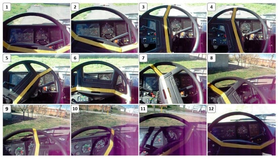 Many experiments have been performed within the CSIC experimental test area. Figure 17 illustrates the automatic control of the articulated bus following a required trajectory. The steering wheel angular rotation experimental data are shown as the correlation with the real trajectory. In this way, many longitudinal and lateral control algorithms were compared using this experimental platform, where reliable external references, sensors and electronic instrumentation have been demonstrated to be very useful. Figure 18 shows the steering wheel in automatic mode in several positions (video snapshots) when the bus is passing by one curved section of the test lane, during one of the experimental proofs.