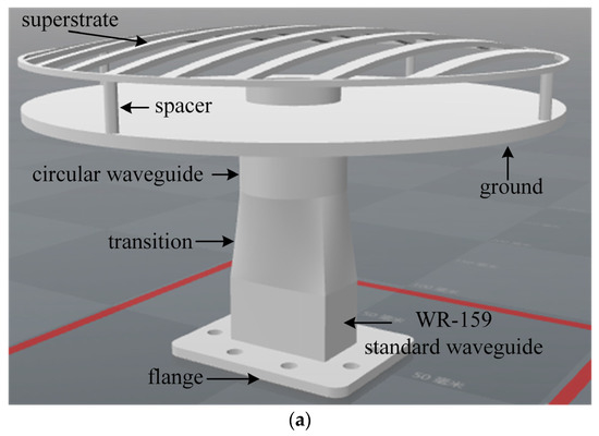 High gain antennas are desirable in many applications, such as radar, wireless communication and microwave power transmission. As a kind of widely used high gain antennas, the Fabry–Pérot resonant antenna (FPRA) is formed by placing a superstrate with partial reflection property in front of an excitation antenna with a ground plane [1,2,3,4,5]. Various antennas have been selected as the excitation antenna for the FPRA, such as the open waveguide antenna, the microstrip antenna, and the microstrip array antenna [1,4,6]. The superstrate could be a homogeneous dielectric substrate [3,7], or metamaterial inspired one, that is usually a printed circuit board (PCB) etched periodic microstrip unit cells [2,4,8,9]. In comparison with other high gain antennas such as parabolic antennas and microstrip array antennas, the FPRA possesses advantages of high gain, low profile, and high radiation efficiency.