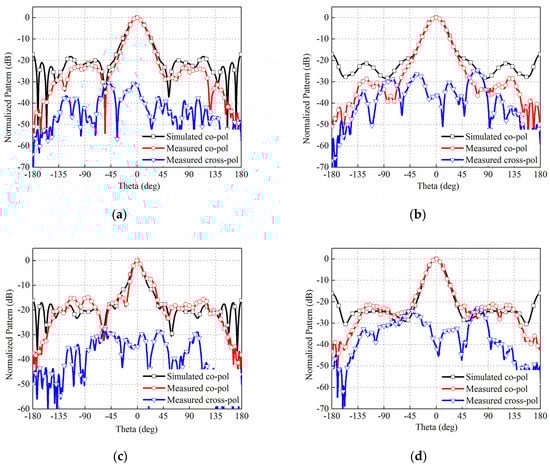The radiation pattern of the 3-D printed antenna is measured in an anechoic chamber. Figure 10 plots the co-polarization and cross-polarization in E-plane and H-plane at 5.8, 6, 6.2, and 6.5 GHz respectively. It can be observed that the proposed FPRA performs good directive radiation patterns at all of those frequency points. The measured cross polarizations are also presented, which are less than −25 dB at the broadside. The polarization of the FPRA is consistent with that of the feeding antenna, which can be easily changed by employing a feeding antenna with a different polarization. With the increase of frequency, the side-lobe levels are also increased, this phenomenon has been observed with many wideband Fabry–Pérot resonator antennas [25].