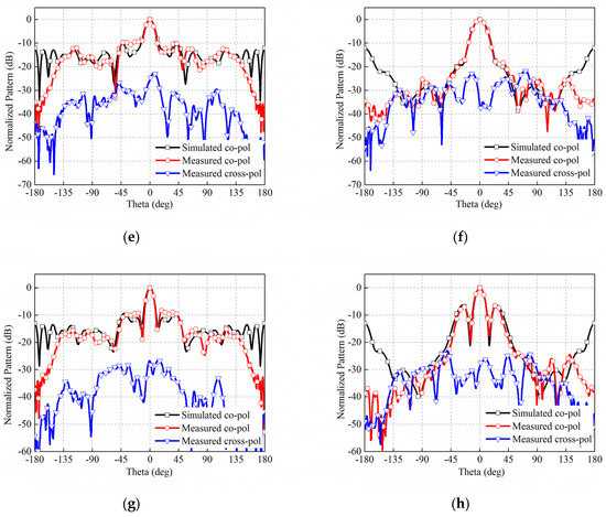 Normalized radiation patterns of the proposed FPRA: (a) E-plane at 5.8 GHz; (b) H-plane at 5.8 GHz; (c) E-plane at 6 GHz; (d) H-plane at 6 GHz; (e) E-plane at 6.2 GHz; (f) H-plane at 6.2 GHz; (g) E-plane at 6.5 GHz; and (h) H-plane at 6.5 GHz.