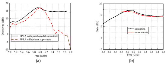 The simulated gains against the frequency for the proposed FPRA with a paraboloid-shape superstrate and the FPRA with a traditional planar superstrates are presented and compared in Figure 11a. The 3-dB gain bandwidths for those two FPRAs are 22.2% (from 5.67 to 7 GHz) and 6% (from 5.81 to 6.17 GHz), respectively. It is obvious that the paraboloidal superstrate significantly improves the gain bandwidth in comparison with a traditional planar one. Figure 11b compares the simulated and measured gain–frequency response for the proposed FPRA, one can observe they are in good agreement.
