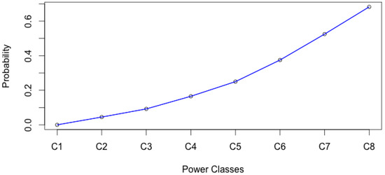When considering that the wind speed follows the Weibull distribution [49], the wind turbine power curve is monotonically increasing in accordance with the defined intervals of the power classes, and a large sample (data of approximately one year) is available, it can be assumed without a loss of generality that there is an order-preserving relation between the components of vector p, i.e., p1 < p2 < … < pn (note: the order-preserving relation is not a necessary condition for the proposed method). Interpolating the Fisher-Jenks intervals vector and the vector of PLM, a function describing the probability of negative misclassification of each power class is obtained. This function helps to mitigate the negative effects of a poor rating based on the estimation of wind power, penalizing the upper classes where the risk of misclassification is higher due to the inherent volatility of wind at high speeds, as shown in Figure 1, for the N = 8 power classes obtained by the Fisher-Jenks method.