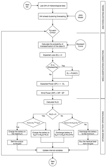 - Misclassification correction: This step is used in the scenario (c) to adjust the wind power forecasts using the PLM method. To simulate misclassified stochastic events, a random binary variable d = (di) that follows a binomial distribution with probability pi is defined, where pi is the PLM value of the predicted power class at time i. If the value of the random variable di is equal to 1, the forecasted power production in period i is considered to be higher than the real power value, and thus it is downgraded by one production class. For example, if the power production of period t was assigned to the power class C5 and the random variable di is equal to 1, then the forecast is downgraded to the power class C4. Under these conditions, it is expected that the performance of the system decreases, followed by a decrease in the battery SoC and a potential increase of system costs due to the purchase of extra electricity from the grid. The expected power loss at time t is calculated, in percentage terms, as:where LGM is a constant defined as the percentage of power losses given an event of low misclassification. In this case, the output of the ANN model is adjusted by the factor 1-EL in order to calculate the expected power.