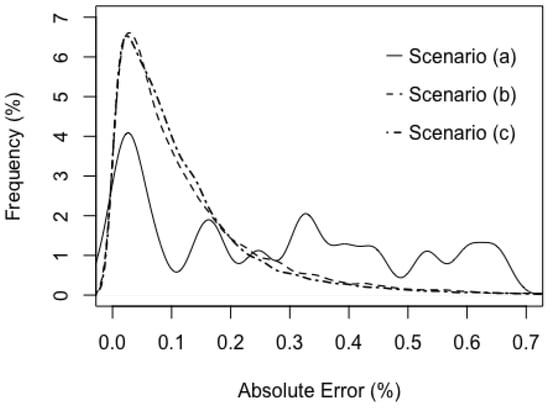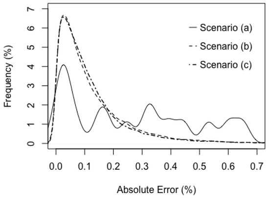 Examining the distribution of the accuracy of the forecast on a daily basis, it may be observed that 75% of the forecasted values have an absolute error of less than 44.36% in scenario (a), as compared with 16.56% and 15.46% in scenarios (b) and (c), respectively. This result provides an overview of the distribution of forecasting errors during the simulation. Figure 3 depicts the error distribution for the scenarios in case study 1.