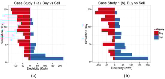 Case Study 1: Electricity purchased vs. electricity sold in scenarios (a,b). The diagram on the right shows the increase in selling events with respect to the scenario (a).
