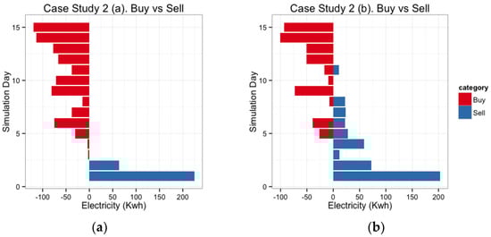 Comparing scenarios (a) and (b), the results in Figure 6 clearly show that the electricity purchased significantly decreases and electricity sold significantly increases in scenario (b), while similar results were observed for scenario (c). Table 5 shows a summary of the descriptive statistics that were obtained for case study 2, where it is noted that the results on net profit and battery charge are fully aligned to those of case study 1.