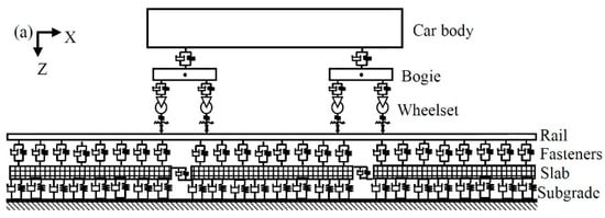 Figure 1 shows a three-dimensional dynamic model of a metro vehicle which coupled with a conventional ballastless track which can predict the curve squeal when a vehicle negotiates narrow curves. The dynamic model is based on the classical dynamic theory, which was also successfully applied to many research topics in rail transit field [,,,,,]. In this paper, the car-body and two bogies are modelled as rigid bodies. The primary and secondary suspensions are modelled as spring-damp elements. The track system is a triple-layers model as demonstrated in [], in which the couple of rails are modelled as Timoshenko beams. The explicit integration method in [] is used to solve dynamic equations.