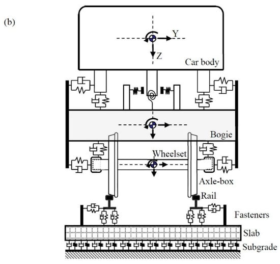 Coupling dynamic model of a metro vehicle and a conventional ballastless track: (a) Elevation; (b) End view.
