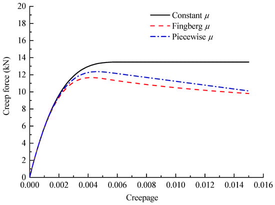 Creep force-Creepage relationship based on three kinds of friction coefficients.