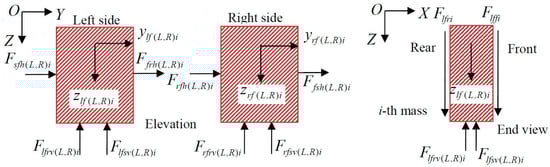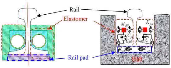 Figure 4 shows the force diagram of elastomer of filling material (the mass in Figure 3). The lateral and vertical motions of elastomer of filling material on left side and right side of the one rail are written in Equations (10)–(13). The stiffness (Kph and Kfill_v) and damping (Cph and Cfill_v) are including in forces in Figure 4.