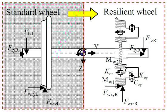 In addition to the embedded track, the resilient wheel is also examined. Figure 5 shows the dynamic model of resilient wheel. The lateral and vertical motions of resilient wheel are written in Equations (14)–(19).