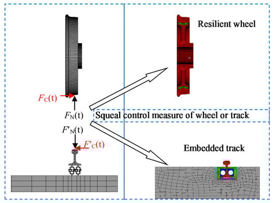 Three-dimensional (3D) finite element (FE) models of a standard metro wheel and a conventional slab track were developed to obtain the vibrations (Figure 6). In the model, the normal forces and lateral creep forces obtained by the vehicle/track interaction dynamic model in Section 2.1 are applied to the tread of wheelset and rail head. Figure 6 also shows the FE models of resilient wheel and embedded track to analyze their effect on wheel/rail noise attenuation under lateral excitation. The FE model was developed in commercial software ANSYS.
