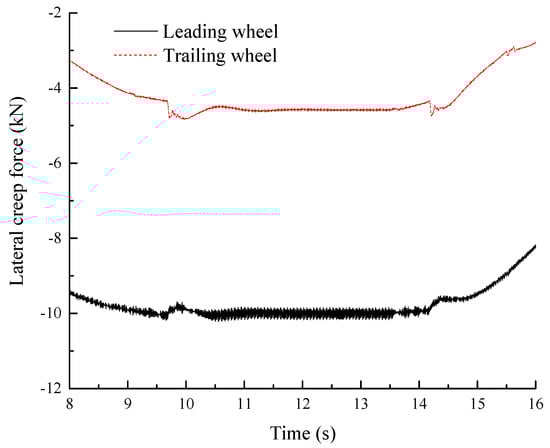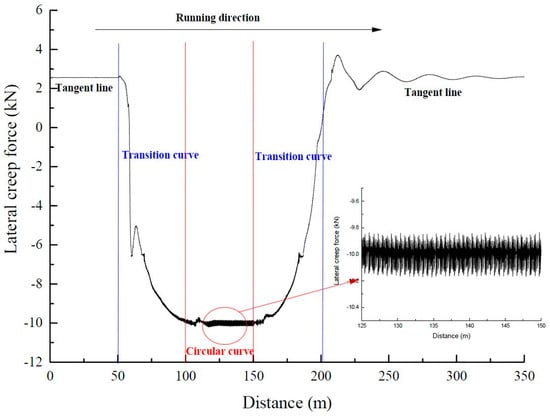 Lateral creep force of the leading wheelset when a vehicle negotiates a narrow curve (simulation results).