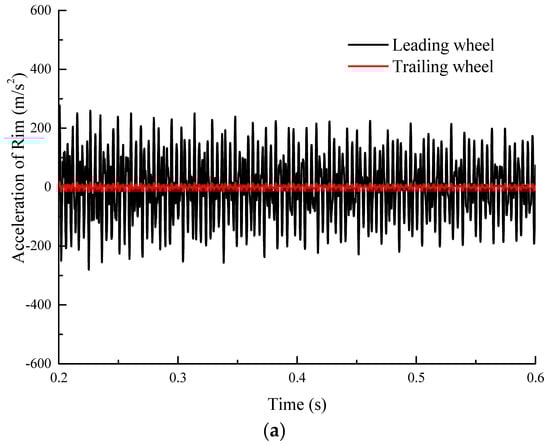 Acceleration of leading wheel and trailing wheel in (a) time domain and (b) frequency domain (simulation results).