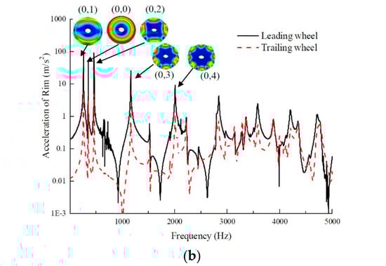 Figure 9a,b give the acceleration of leading inner wheel and trailing inner wheel in time domain and frequency domain. It can be seen that the acceleration of the leading inner wheel with squeal is much larger than that of trailing inner wheel without squeal. In addition, highest peaks occur at modal frequencies corresponding to axial modes with zero-nodal-circle, showing that these modes are easy to be excited during curving. The axial mode shapes of wheel are expressed as (m, n). m represents number of nodal circle. n represents number of nodal diameter. For example, (0, 1) represents zero-nodal-circle with one-nodal-diameter. Thus, the frequencies and corresponding axle mode shapes are 265 Hz (0, 1), 353 Hz (0, 0), 468 Hz (0, 2), 1167 Hz (0, 3), and 2008 Hz (0, 4). These frequencies by simulation in this paper have a good agreement with the FRF test in the semi-anechoic room [].