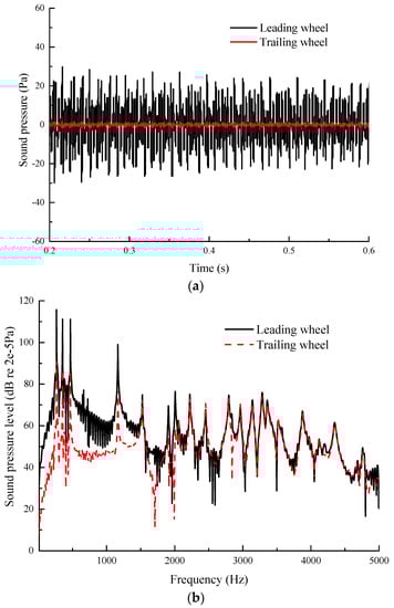 Figure 10a,b give the sound pressure level (SPL) (at the point which is 30 cm away from the outside of wheel tyre) of leading wheel and trailing wheel in time domain and frequency domain. It can be seen that the SPL of the leading wheel with squeal is much higher than that of trailing wheel at frequencies of axial modes.