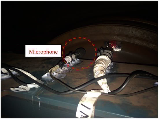 Wheel/rail noise is also tested near a wheel (860 mm diameter) used in metro when the vehicle passes a sharp curve (radius = 250 m) at the speed of 45 km/h. The microphone is arranged in the outside of the leading wheel with the distance of 30 cm, which is shown in Figure 11. In the process of field test, squealing noise can be heard clearly. Figure 12 gives comparison between simulation and experimental results of SPL of the leading wheel with the same curve radius and running speed.