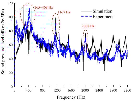 Figure 12 shows that the SPL at the frequencies of 265–468 Hz, 1167 Hz, 2008 Hz are significant for both simulation and experimental results. These frequencies have a good agreement with the zero-nodal-circle and n-nodal-diameter axial wheel modes for simulation and experimental results. Amplitude difference percentages between simulation and experiment of 265–468 Hz, 1167 Hz, and 2008 Hz are 3%, 7%, and 6.5% of their corresponding peaks, respectively. The differences mainly come from the simplification and assumption of the actual situation from the simulation model. In other words, the current model can predict all squeal frequencies and give relatively accurate amplitudes of them. Thus, this simplified model can be used for regular investigation on wheel/rail noise when the vehicle curves.