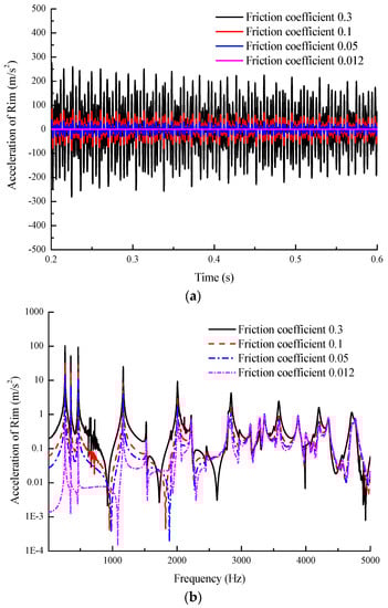 Accelerations with different friction coefficients in (a) time domain and (b) frequency domain (simulation results).