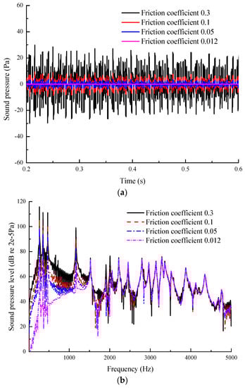 SPLs with different friction coefficients in (a) time domain and (b) frequency domain (simulation results).