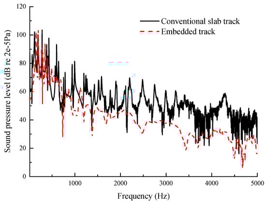 SPLs of track comparison between conventional slab track and embedded track (simulation results).