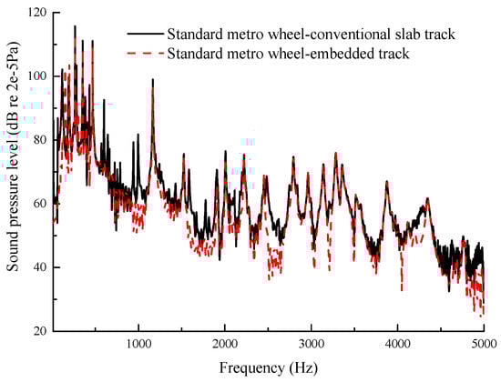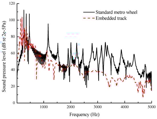 Figure 16 gives the total SPLs considering standard metro wheels coupled with the conventional slab track and embedded track respectively. It can be seen that when the embedded track coupled with a squealing wheel, the reduction of sound is limited (about 2–3 dB) because the wheel is the main sound radiation source when squeal occurs, as is shown in Figure 17. In Figure 7, the SPL of a standard metro wheel is compared with the embedded track because the contribution of wheel/rail noise must be clear. The SPL of the standard metro wheel is larger than that of track in a wide frequency domain which contributes significantly to the total value of wheel-rail noise. Although the embedded track is not significant on the reduction of wheel/rail noise in the curve, it may have more effect on reducing rolling noise [,].