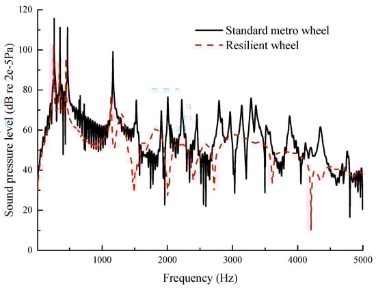 This section investigates the effect of resilient wheel on wheel/rail noise under lateral excitation. The SPL of resilient wheel is calculated based on the resilient wheel dynamic model and transit BEM model in Section 2.1 and Section 2.2. Figure 18 shows the SPLs of wheel comparison between the standard wheel and the resilient wheel. It can be seen that the resilient wheel has a very good reduction in sharp peaks, especially for the peaks of squeal frequencies, due to high damping in the resilient wheel and decoupling of the rim and web.
