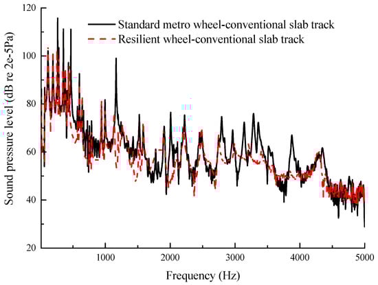 Figure 19 gives the total SPLs of conventional slab track coupled with the standard metro wheel and resilient wheel respectively. It can be seen that when the resilient wheel coupled with the conventional slab track, the reduction of sound is significant (about 5–6 dB) because the resilient wheel can reduce squeal noise of wheel, which is main source for squeal noise, namely the main sound source is controlled. Thus, the total SPLs is reduced by using resilient wheel.