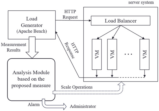 In the actual operation and management of the server system, methods to determine the timing of scaling based on the utilization rate of computing resources are widely used. These are methods for monitoring the utilization rate of computing resources, such as CPU, memory, and storage allocated to virtual machines (VMs), and applying the scaling operation based on a preset resource utilization threshold [4,5,6]. In this method, because the scaling operation is performed when the utilization rate of the computing resources allocated to VMs increases, it is possible to prevent the service from being overloaded. When applying this method to an actual server system, it is necessary to consider the overhead that accompanies capturing the state of the service, and researchers have highlighted that it is difficult to accurately measure the utilization rate of a computing resource in a virtual environment [7].