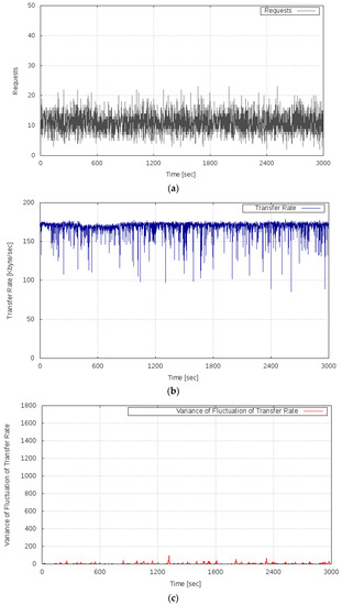 Figure 7 shows the results of Experiment 1. Figure 7a shows the transition of the server load (the number of requests), Figure 7b shows the transition of the observed transfer rate, and Figure 7c shows the behavior of the variance of the fluctuation of the observed transfer rate. As can be seen from Figure 7b, under the conditions of this experiment, the server system ran stably, that is, it did not fall into an overloaded state. Additionally, as shown in Figure 7c, the variance of the fluctuation of the transfer rate remained almost zero. From this result, it is confirmed that the variance of the fluctuation of the OT of the server system did not increase when the amount of computing resources of the server system was sufficient for the server load, as the analysis result described in Section 3.