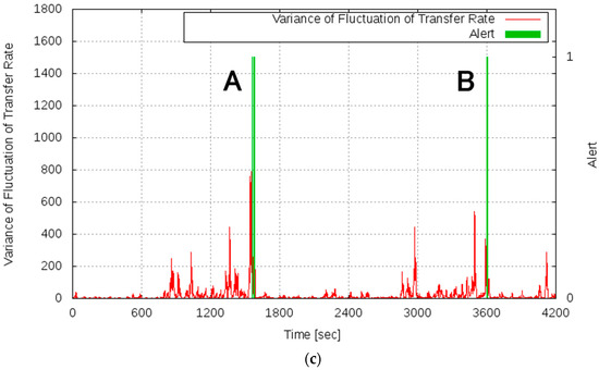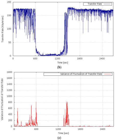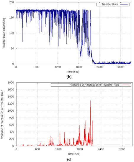 By contrast, it can be seen that the variance of the fluctuation of the transfer rate shown in Figure 9c increased in the period of 0–599 s. This phenomenon, by which the variance of the fluctuation of the transfer rate increased as a sign of the overload condition, is equal to the result of Experiment 2. In the period of 600–1199 s, while the server system was in the overloaded state, the variance of the fluctuation of the OT was in the vicinity of zero. It can be confirmed that the variance of the fluctuation increased again in the period of 1200–1499 s. After 1500 s, the variance of the fluctuation converged to almost zero as the server system recovered to the normal state. From these results, it was confirmed that the variance of the fluctuation of the transfer rate increased immediately before the server system returned from the overloaded state to the normal state. Therefore, we confirmed the behavioral property as suggested in the proposed method concerning the variance of the fluctuation of the server system.