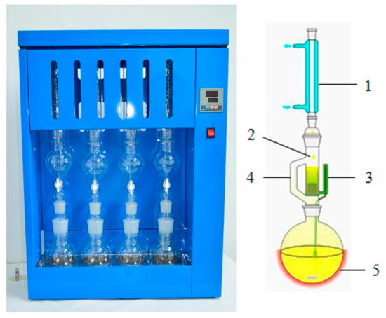 Soxhlet Extractor. Note: 1: condenser tube; 2: extraction tube; 3: siphon tube; 4: connection tube; 5: extraction flask.