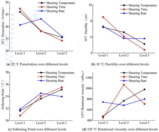 The test results were evaluated by the extreme difference analysis method to optimize the preparation process. According to Table 5, the ranking of influence factor impacting 25 °C penetration, 10 °C ductility, softening point and 135 °C RV was shearing time, followed by shearing temperature and shearing rate, and the optimal combination was suggested to be A2B2C2.