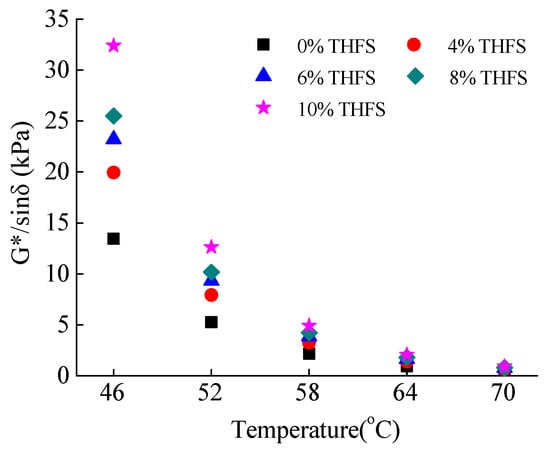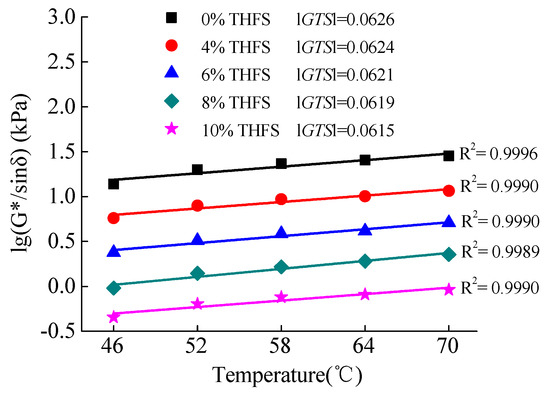 According to the test results in Figure 3, the G*/sinδ values of asphalt binders decreased across the test temperature ranges(46 °C to 76 °C with a 6 °C increment). Under the identical condition of THFS content, there was a major decrease in G*/sinδ value at low temperatures, but a minor decrease was observed at high temperatures. Moreover, the G*/sinδ had a good exponential correlation with the test temperature with a high correlation coefficient R2 ranging from 0.9981 to 0.9989 and is given in Equation (1)