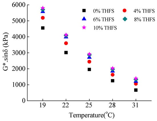 From the test results in Figure 5, it could be observed the G*·sinδ values of asphalt binders decreased across the test temperature ranges. The decrease in G*·sinδ value was nearly identical in the range of test temperature from 19 °C to 31 °C. Moreover, the G*·sinδ had a good linear correlation with test temperature with a high correlation coefficient R2 ranging from 0.9981 to 0.9989. This phenomenon could be explained by the addition of THFS, which reduced the potential for fatigue cracking at intermediate temperatures due to lower malthene and higher asphaltene contents. Subsequently, for THFS modified asphalt binders, the G*·sinδ values were higher than that of SK-90 under identical conditions of test temperature and increased as THFS content increased.