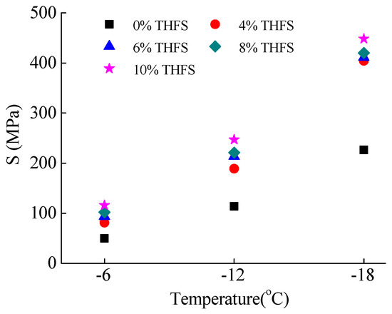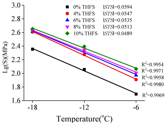 Under the identical conditions of THFS content, the S values of asphalt binders decreased as the test temperature increased and had a good linear correlation with temperature with a high correlation coefficient R2 ranging from 0.9646 to 0.9853. If taking the logarithm of S and temperature T, it was found that the lg(S) had a good linear correlation with test temperature, and is given as Equations (4) and (5).