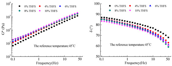 Moreover, for THFS modified asphalt binder, there was a slight increment in G* values and a minor reduction in δ values as THFS content increased at the same frequency. This can be attributed to the interaction of THFS and asphalt binder that form more and more large molecules and limit the movement of molecular chains of asphalt binder. The increase in G* values and decrease in δ values were statistically significant at the 5% significance level, which indicated that THFS content had a significant effect on the frequency susceptibility of THFS modified asphalt binder.