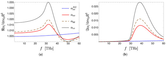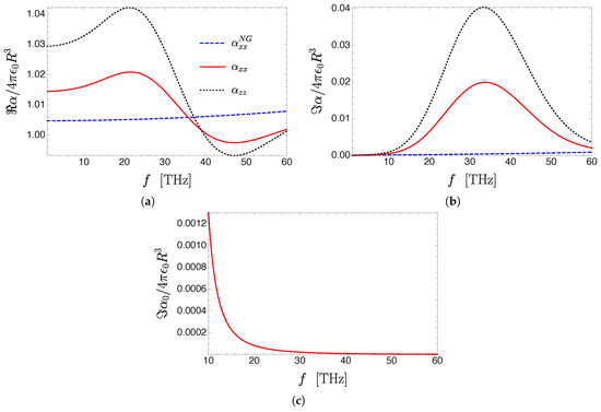 After performing the integration over the angular variable in Equation (54), we find that is diagonal. Rotational invariance along the z direction imposes that , which will differ from . The same will be true for the polarizability of the nanoparticle, which, using Equation (51), we can write as